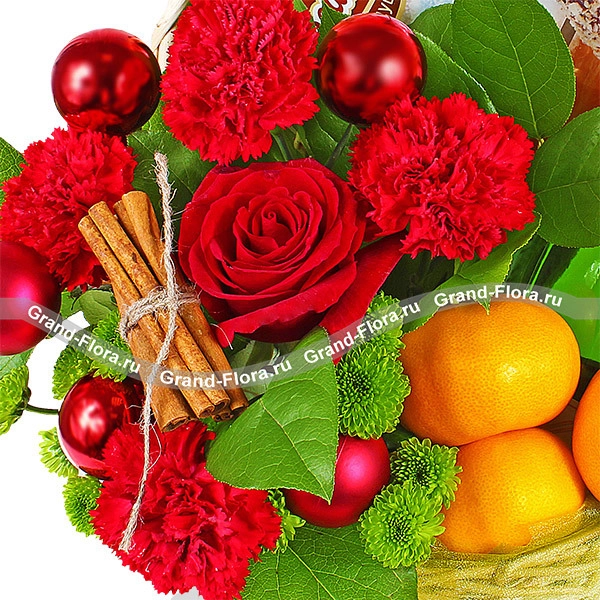 ЛЮКС: гвоздика - 5шт., роза красная - 1шт., хризантема зеленая (сантини) - 2шт., корица, мандарины - 1,5кг., конфеты "Родные просторы" (278 г.) - 1шт., еловая ветвь - 2 шт., новогодний декор и зелень, желтый фетр, оазис, корзина средняя.