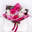 Уменьшенный: орхидея белая - 1 шт., гербера малиновая - 1 шт., хризантема кустовая розовая - 1 шт., эустома розовая - 1 шт., тюльпан розовый - 1 шт., тюльпан фиолетовый - 1 шт., роза кустовая фиолетовая - 1 шт., эвкалипт, упаковка, лента. Примерный размер: 20Х20 см. (тюльпаны не в сезон заменяются на розы, эустому или альстромерии в зависимости от свежей поставки)